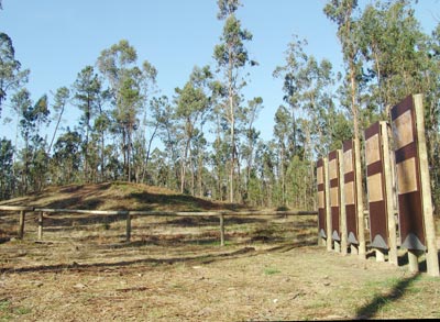 Uma vez cortados, os grandes blocos de pedra eram arrastados até ao local onde se queria fazer o túmulo. Os Esteios – blocos que ficavam ao alto e constituíam as paredes do túmulo, eram deixados cair para dentro de buracos aberto no solo, ficando semi enterrados, como se pode ver na figura do painel 1. Até a terra envolvente ficar mais sólida eram provavelmente fixados com troncos. Não sabemos se utilizavam animais para puxar as pedras, mas dado que eram pastores, esse facto é muito provável. Não sabemos também se o sistema de atrelagem ao animal seria o desenhado. O desenho constituí pois apenas uma hipótese.